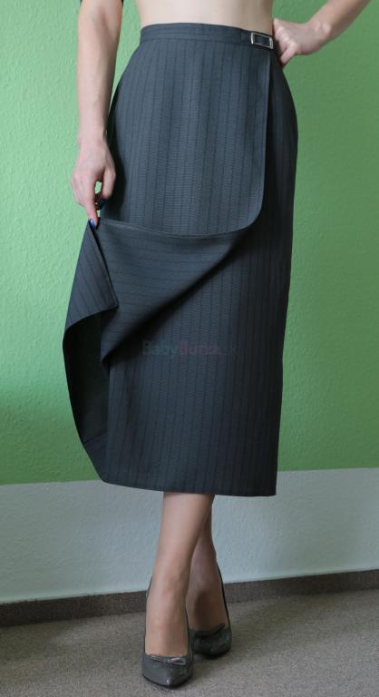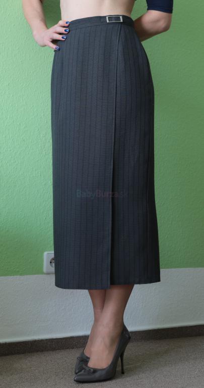 Sivá sukňa v business štýle lady dĺžky, klasický strih a faošné zavinovanie, zaujímavý vlasový prúžok. Príjemný tenký materiál: 57% viskóza, 43% polyester. Veľkosť 36, rozmery rada zašlem. Žiadne vady. Poštovné 2,5€.